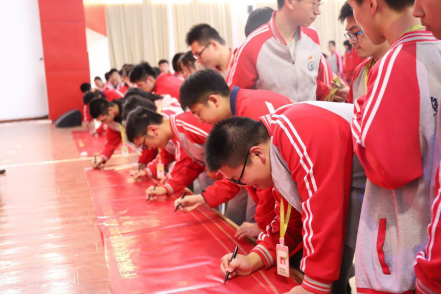各班學(xué)生分別到臺前簽名,表達(dá)自己的雄心壯志,堅持砥礪前行。一個個形各異卻志相同的名字仿佛在無聲地宣告同學(xué)們必定將努力落實在行動上的決心。